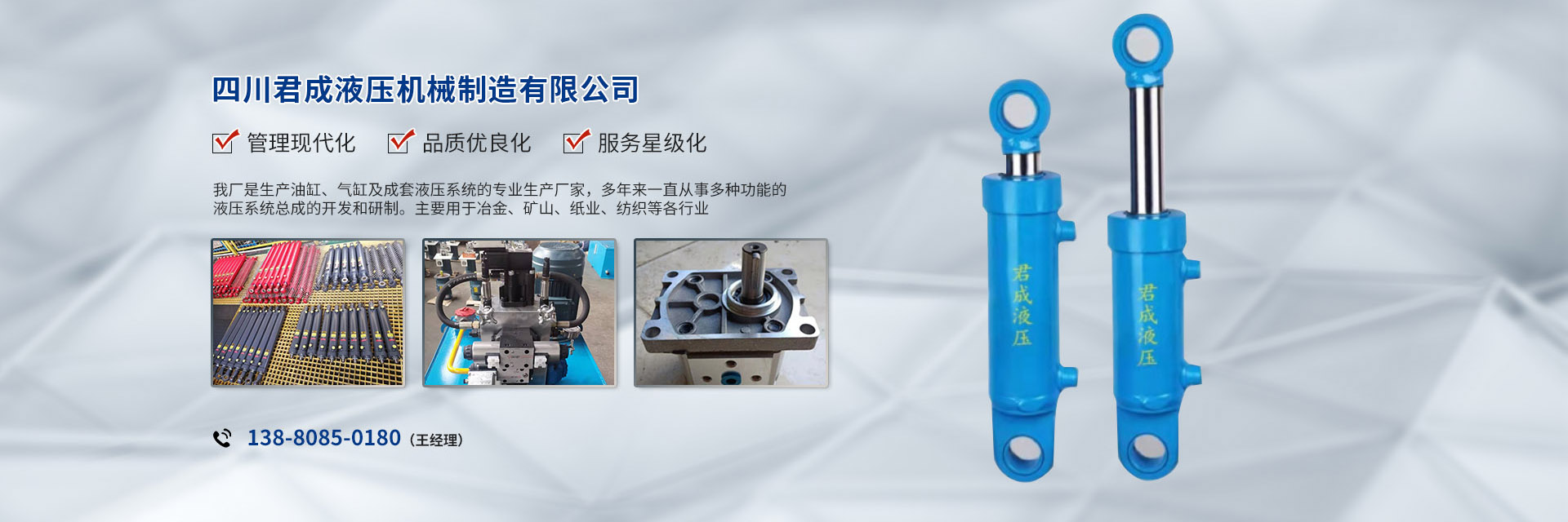 公司主導(dǎo)產(chǎn)品:液壓油缸HSG1全系列,YHG1型冶金設(shè)備缸,以及GHF1系列高壓液壓缸、多級缸等。扣壓式全系列液壓膠管以及特殊要求的液壓膠管總成。公司銷售項目還包括各種管接頭、多路閥、液壓鎖、液壓系統(tǒng)、頂磚機、全液壓式垃圾庫等,承接各類大、中型成套液壓系統(tǒng)的設(shè)計制造、安裝和調(diào)試服務(wù)。